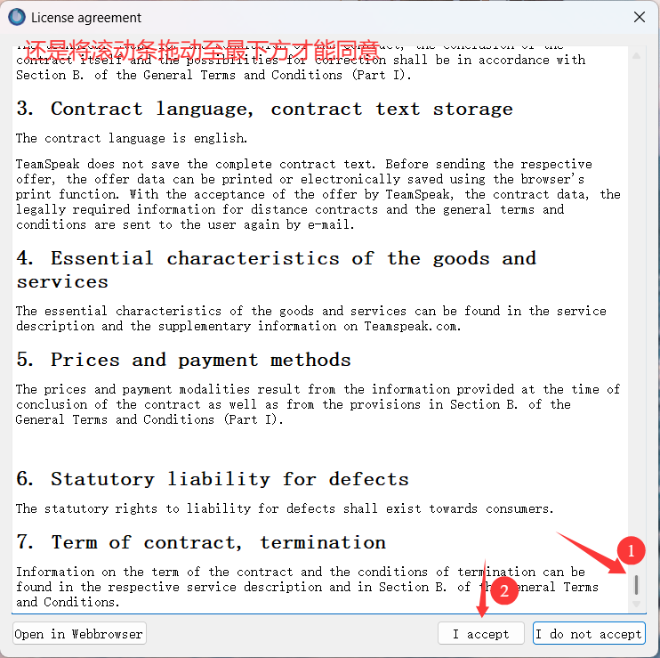 将右侧滚动条拖动至最下方,然后点击 Accept 按钮。