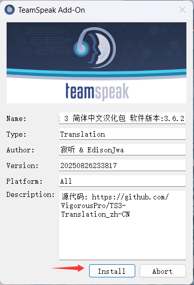 双击 Chinese_Translation_zh-CN.ts3_translation 打开插件安装界面。